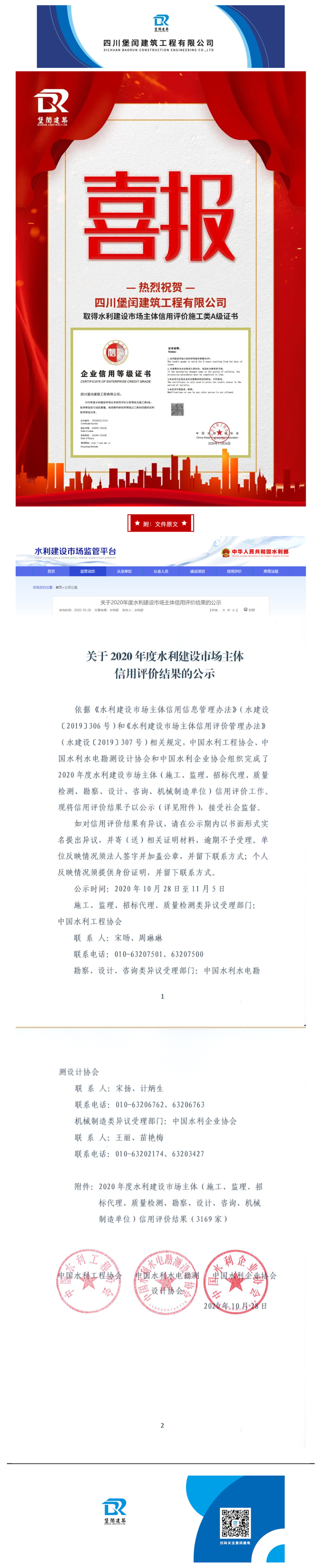 熱烈祝賀四川堡閏建筑工程有限公司取得水利建設市場主體信用評價施工類A級證書